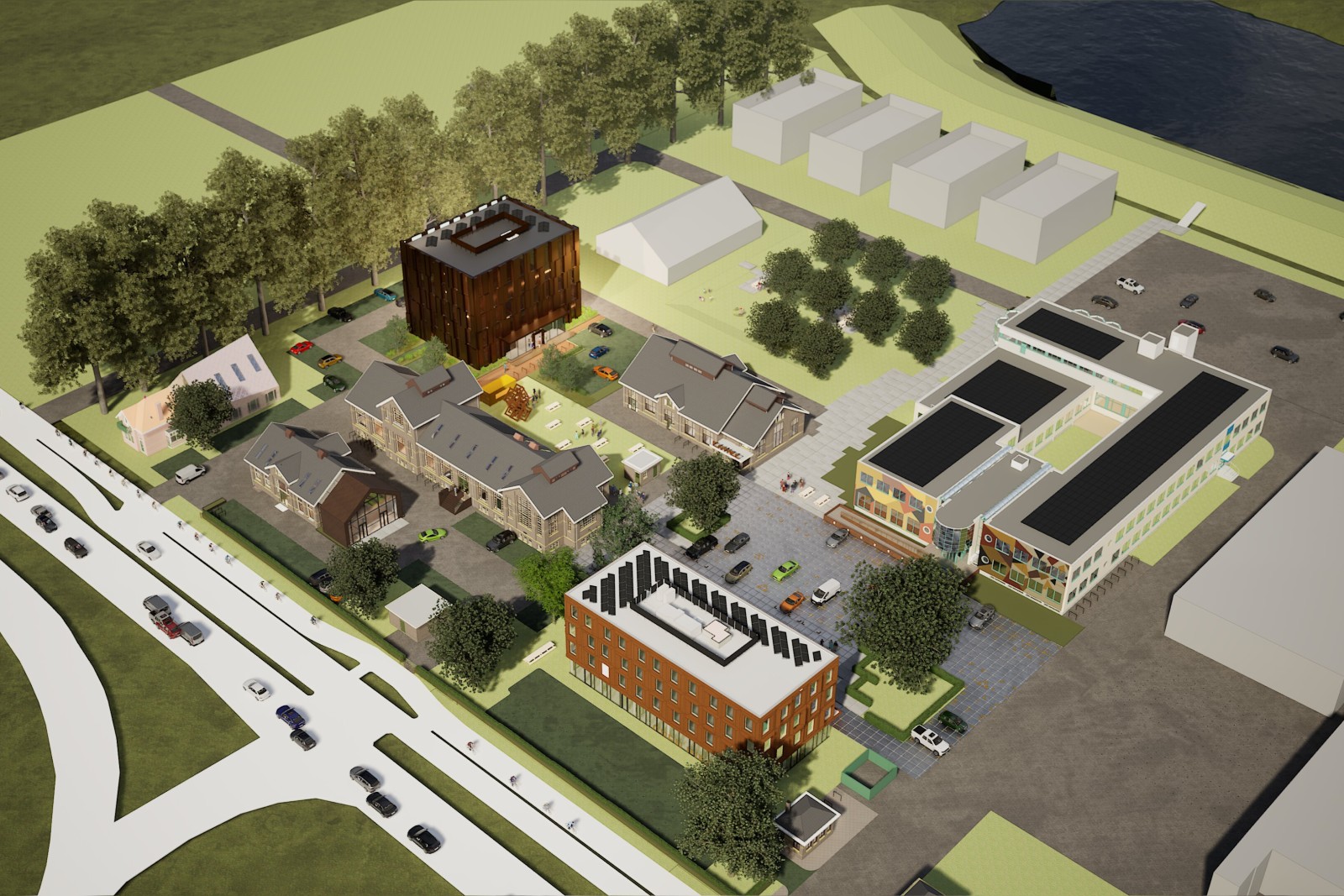 De tweede benadering is het expo gebouw. Het betreft een architectuur die expressief en eigenzinnig is waardoor het campusgevoel wordt onderstreept. Een expo gebouw is vrijstaand en autonoom. Het heeft een gevelbeeld dat eigentijds is en geen klassiek opbouw kent zoals de bestaande authentieke gebouwen. Maar ook hiervoor is het verbindende materiaal voor de gevel cortenstaal. Door deze benadering ontstaat er een familie van verschillende ingrediënten; bestaande gebouwen, homogene uitbreidingen en de expo gebouwen. Het trafohuis en het kantoor wordt door Jimki Design & Art studio voorzien van een muurschildering met afgestemde kleuren. Door deze ‘familie’ fraai te mixen op het terrein ontstaat er een aantrekkelijk samenhangend totaalbeeld.