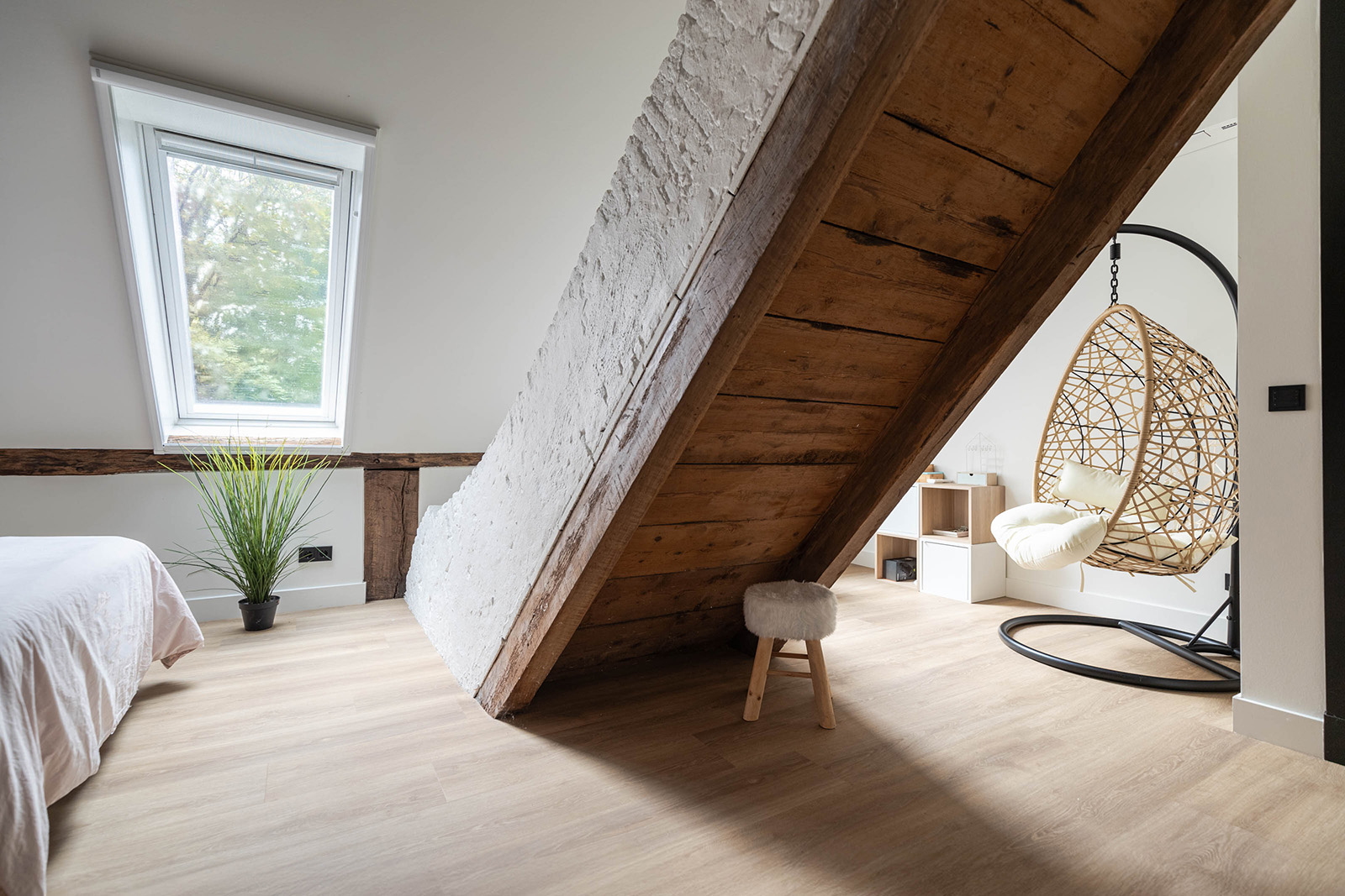 In het voorhuis blijft de indeling nagenoeg authentiek, met behoud van de originele muren en de doorlopende hooizolder. De kelder en opkamer worden in hun oorspronkelijke staat gehandhaafd, waarbij de toegang wordt teruggebracht naar de voorzijde.
