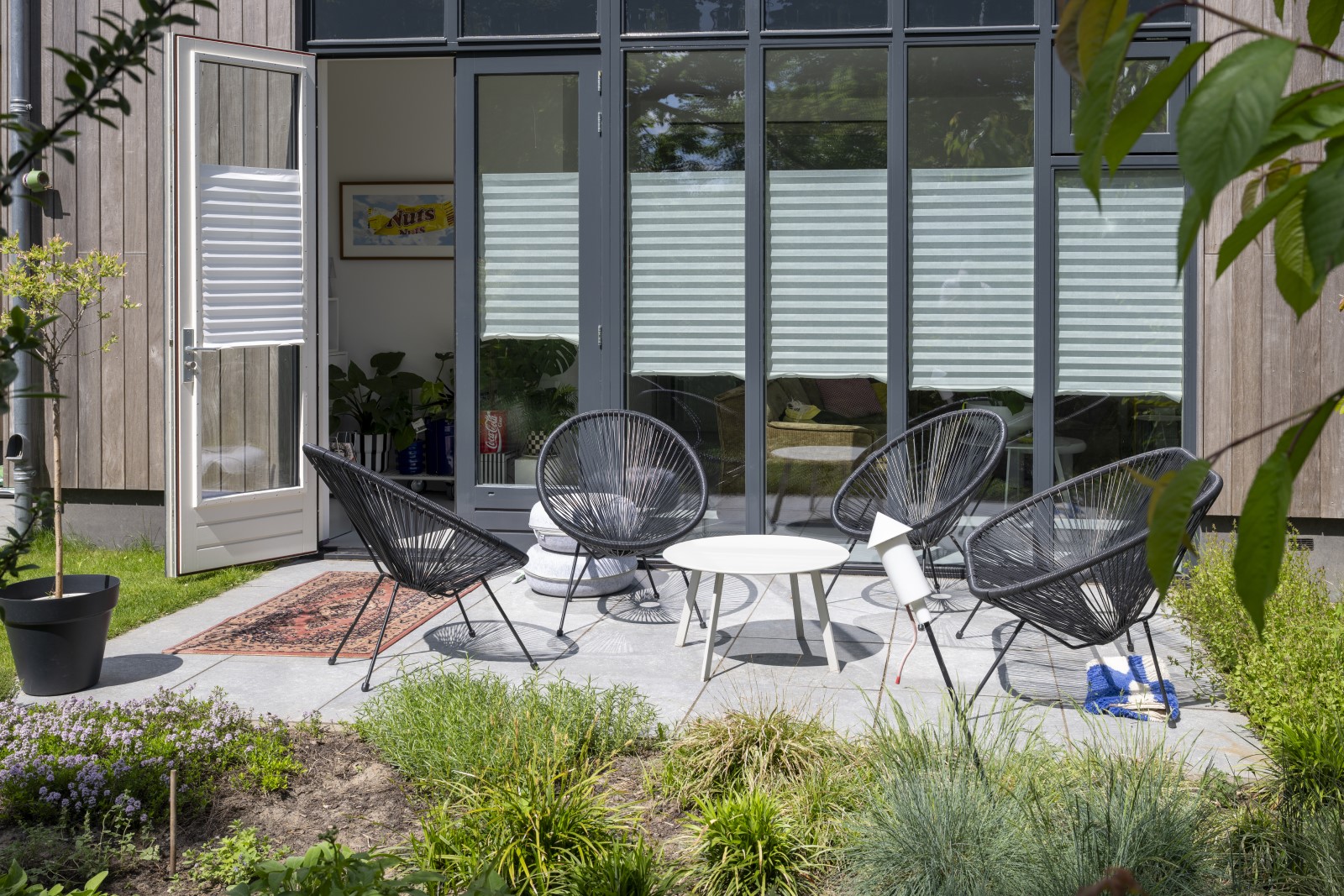 Het platte dak van het bijgebouw heeft een sedumdak. De nestkasten voor vleermuizen zijn gemaakt van hetzelfde materiaal als de gevelbekleding en zorgvuldig ingepast in het gevelontwerp. Deze natuurinclusieve maatregelen zijn daarmee onderdeel geworden van de architectuur. Wij hebben de blije bewoners een prachtig insectenhotel in de vorm van ons logo gegeven, gemaakt door de jongeren van Facet.